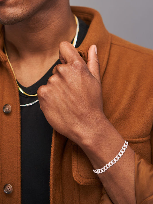Men Classic Cuban Curb Link 925 Sterling Silver Chain Bracelet Set