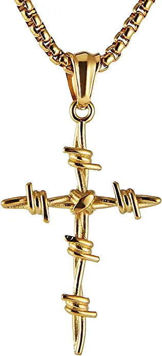 Gold Necklace -Barbed Wire Cross Pendant 316 Stainless Steel Chain
