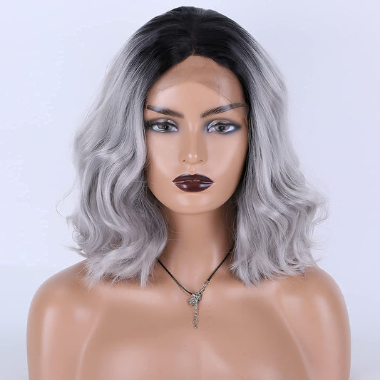 13x4 Short Bob Curly Black Grey Ombre Lace Front Wig