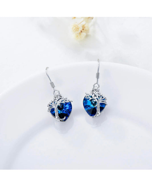 14K White Gold -Crystal Heart Tree of Life Drop Earrings