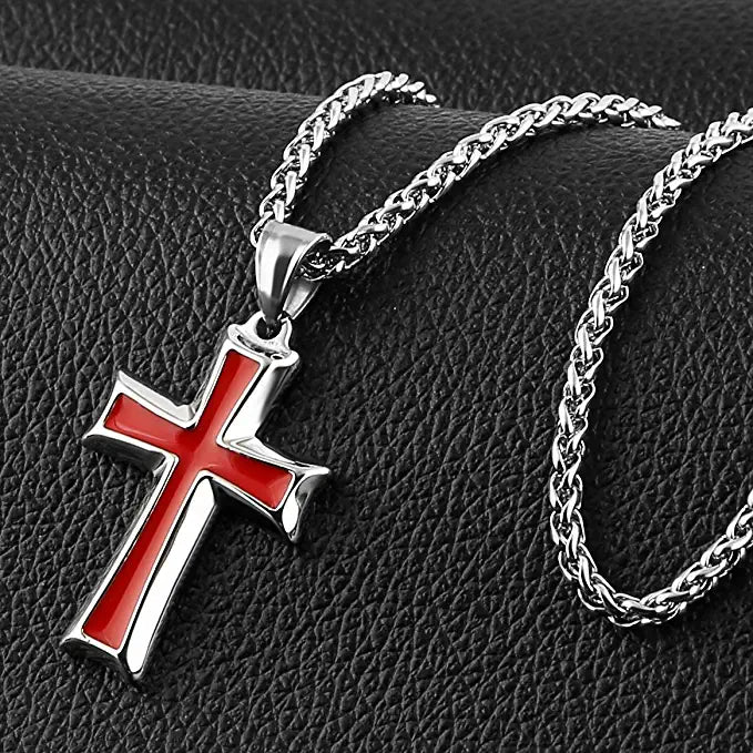 Silver & Red-Men's Stainless Steel Cross Pendant Necklace