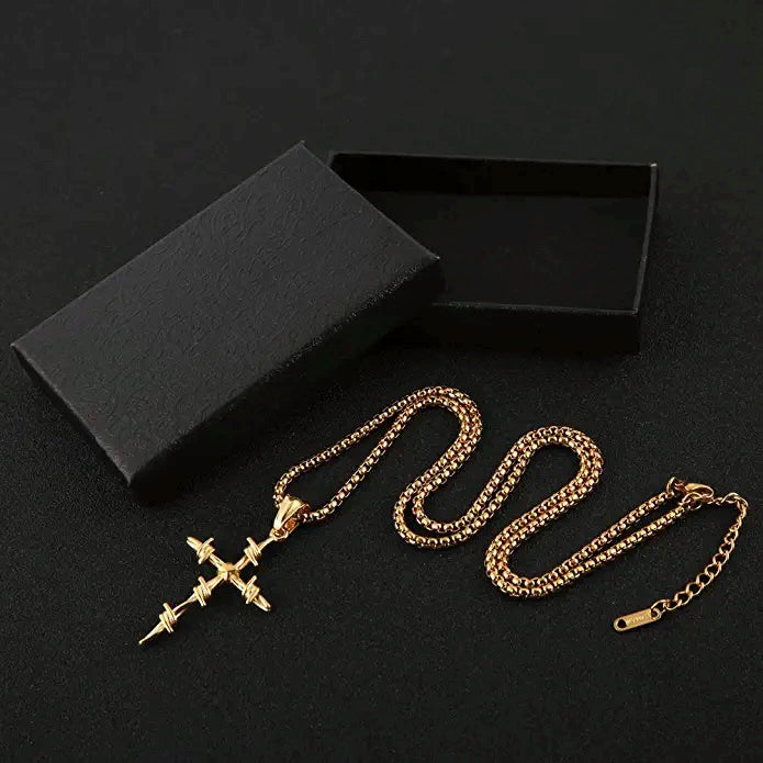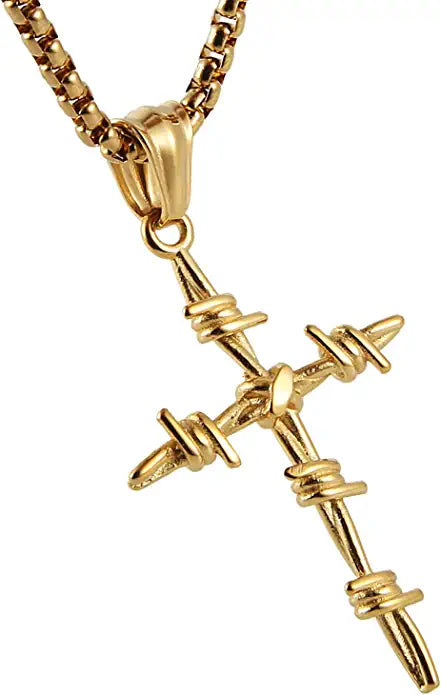 Gold Necklace -Barbed Wire Cross Pendant 316 Stainless Steel Chain