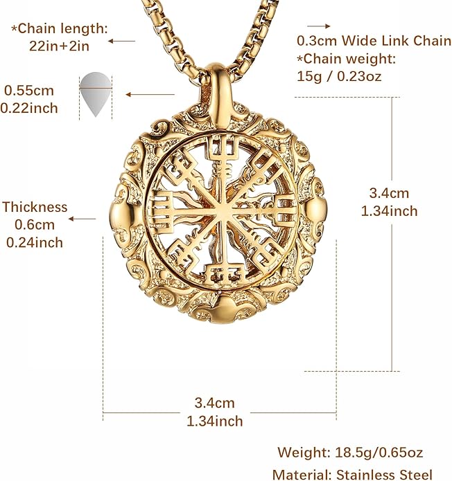 Features the Viking Vegvisir compass on one side for guidance and protection and an ancient sun totem symbol on the other, representing illumination and life’s direction. -